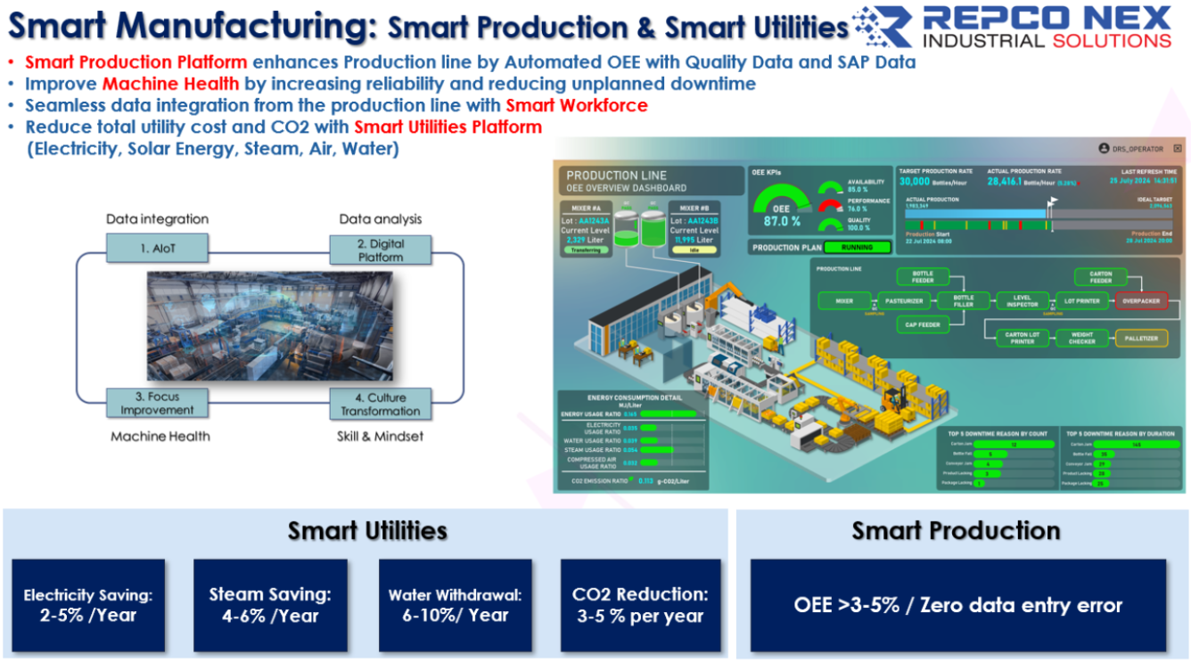 Smart Manufacturing Solution จาก REPCO NEX ถูกออกแบบมาเพื่อแก้ไขข้อจำกัดเหล่านี้ โดยผสาน เซนเซอร์อัจฉริยะ การวิเคราะห์ด้วย AI และแพลตฟอร์มดิจิทัล เข้าด้วยกัน เพื่อให้โรงงานสามารถตรวจสอบและควบคุมการผลิตได้อย่างแม่นยำและทันเวลา